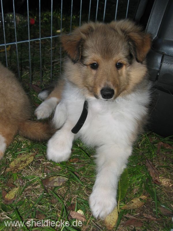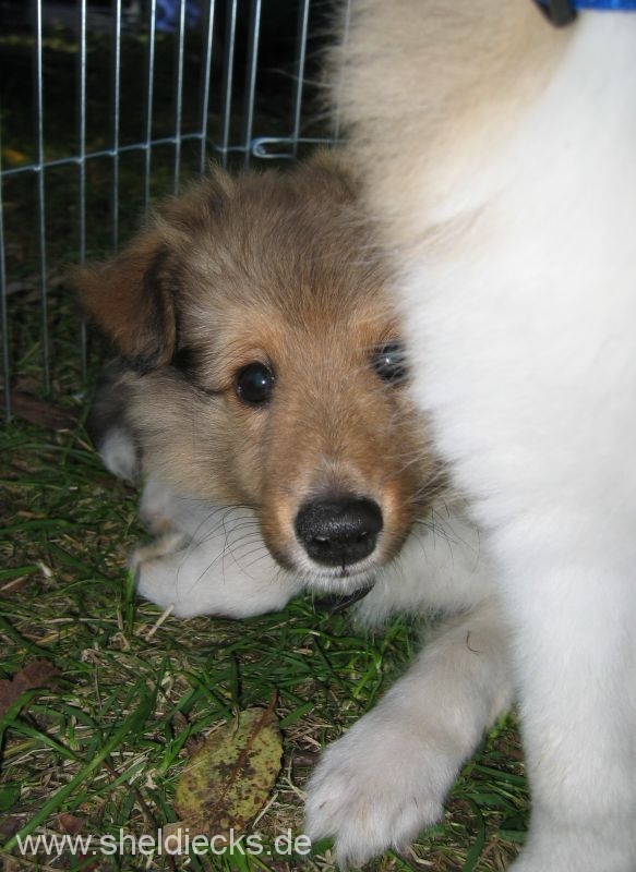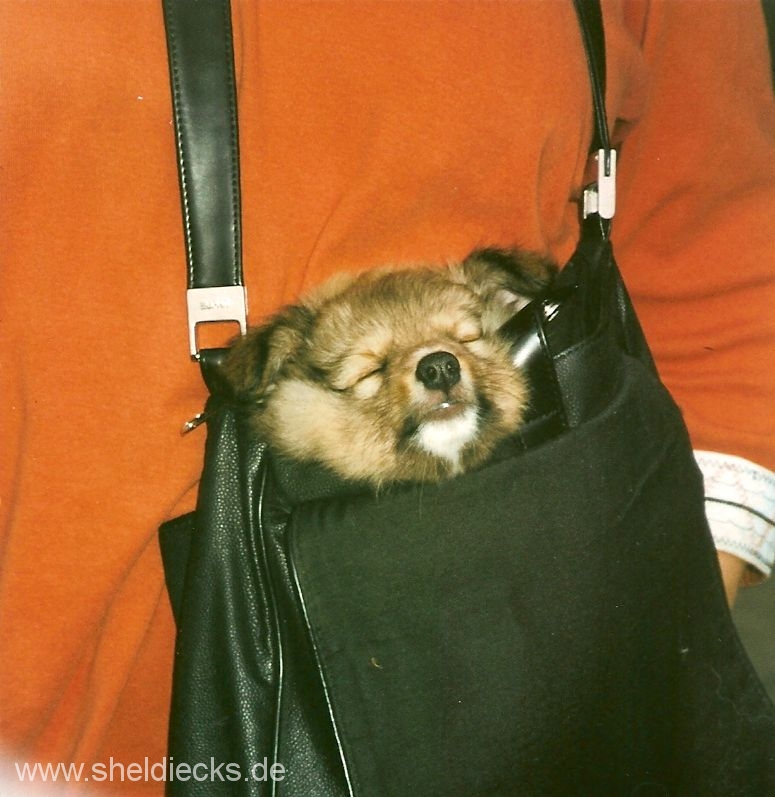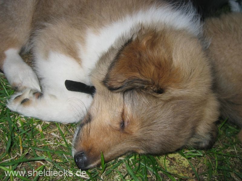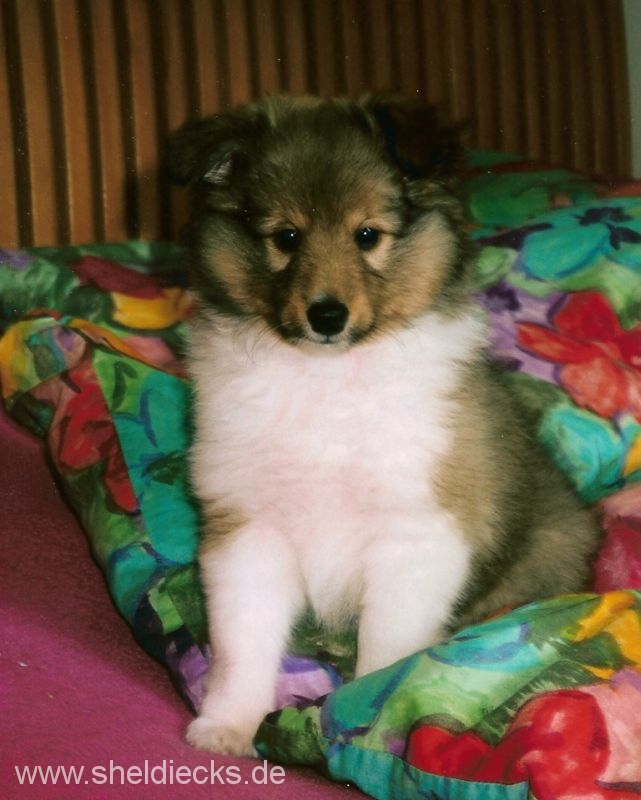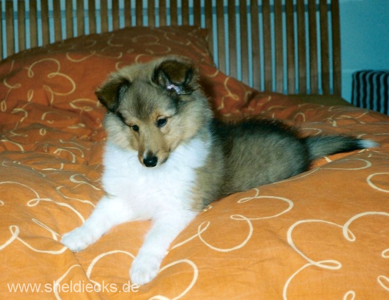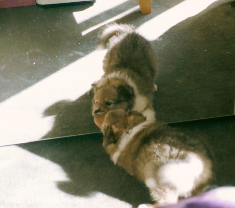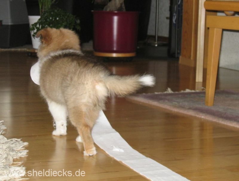 Er war damals der erste, der "ging". Der erste aus dem Wurf, der erste meiner Welpen überhaupt, den ich abgeben mußte. Zum Glück bekam ich schon einige Tage später von Dorina eine CD mit Fotos der ersten Tage. Das Foto mit der Toilettenpapier-Rolle hatte ich wochenlang auf meinem Desktop - habe fast geheult vor Freude, als ich es bekam... Ich wußte, er wird es gut haben!